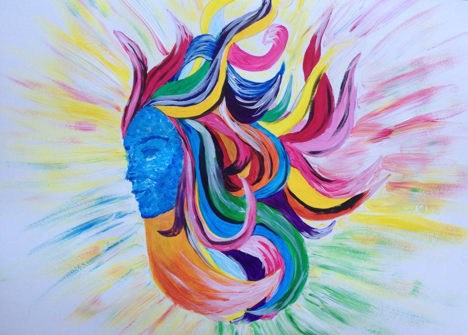 Jag var på väg att lägga ner och försöka få sova lite till när det plötsligt hände något. Det var som om någon tog över min pensel och började måla. Det började träda fram en figur på duken. Det kändes som att jag fick ett budskap. Det låg en uppmaning om att det var dags för mig nu att blomma ut, att inte längre gömma mig. Jag ser målningen som en blyg blomsterflicka som gömmer sig bakom en tjock slöja av hår. Hon tittar blygt fram och är på väg att slå ut i blom. Jag tyckte själv att målningen var väldigt fin och jag tycker fortfarande den är fin. Detta var startskottet för mig vad gäller min målning.