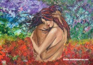 Jag ser tvillingsjälar som den mänskliga manifestationen av den universella twinflameenergin och utifrån min erfarenhet så finns det många aspekter av vår tvillingsjäl. Gemensamt har i mina möten med mina tvillingssjälsaspekter varit en energi som inte går att motstå, en energin som omsluter en och smyger, eller slår, sig in i minsta skrymsle av ens själ. Den går inte att värja sig emot även om man försöker. Båda målningarna i denna post tillkom under mitt hittills sista möte med en tvillingsjälsaspekt. Det var ett möte som knöt ihop säcken och läkte de sår som uppstått i möten med tidigare aspekter. Den sista gången vi sågs integrerades vår energi på ett högre plan och vår resa var klar.